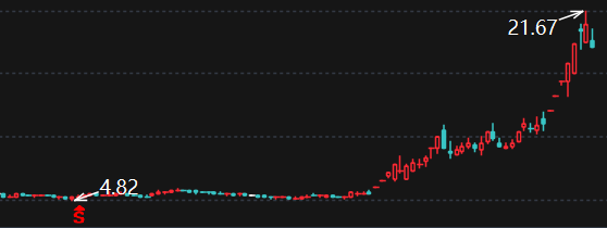 之后的两个交游日又再度高潮了9.94%,并于12日盘中飙升至21块+(21.67元/股)。