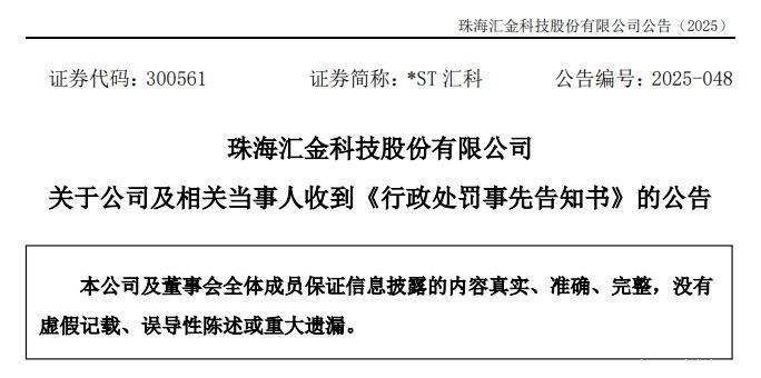 8月8日晚间,从事金融科技业务的上市公司珠海汇金科技股份有限公司(证券简称:*ST汇科,股票代码:300561)公告表露,公司及干系当事东说念主收到广东证监局下发的《行政处罚事前见告书》。证实见告书,*ST汇科涉嫌信息袒露犯法违纪,广东证监局拟对公司偏激3名高管共计罚金600万元。