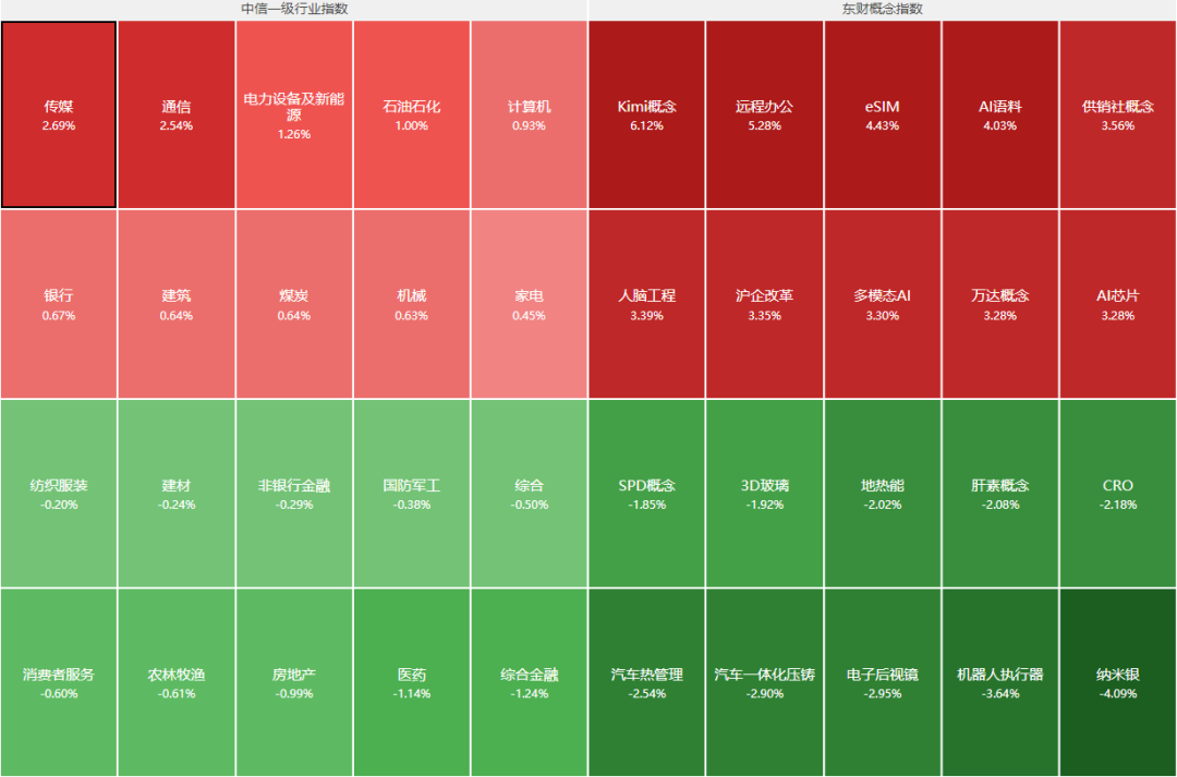 分行业来看,传媒、通讯、电力缔造、石油石化、诡计机等行业领涨,详尽金融、医药、房地产、农林牧渔、破钞者行状等行业领跌。
