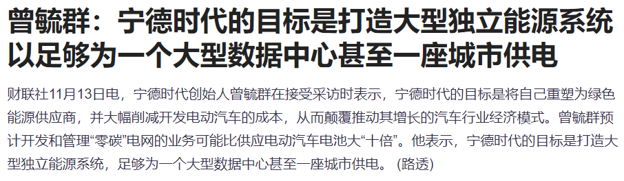 宁德时期首创东说念主曾毓群在禁受采访时暗示,宁德时期的辩论是将我方重塑为绿色动力供应商,并大幅削减开垦电动汽车的成本,从而颠覆推动其增长的汽车行业经济款式。曾毓群瞻望开垦和处分“零碳”电网的业务可能比供应电动汽车电板大“十倍”。他暗示,宁德时期的辩论是打造大型独处动力系统,饱胀为一个大型数据中心致使一座城市供电。